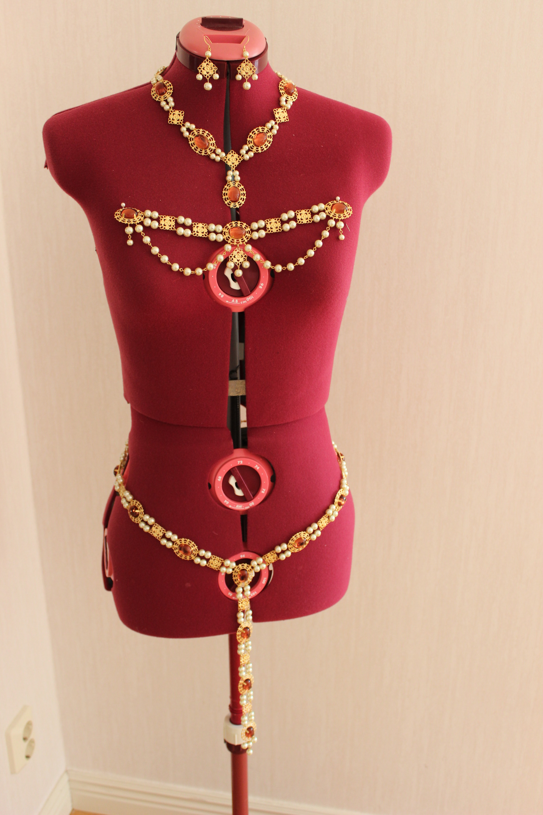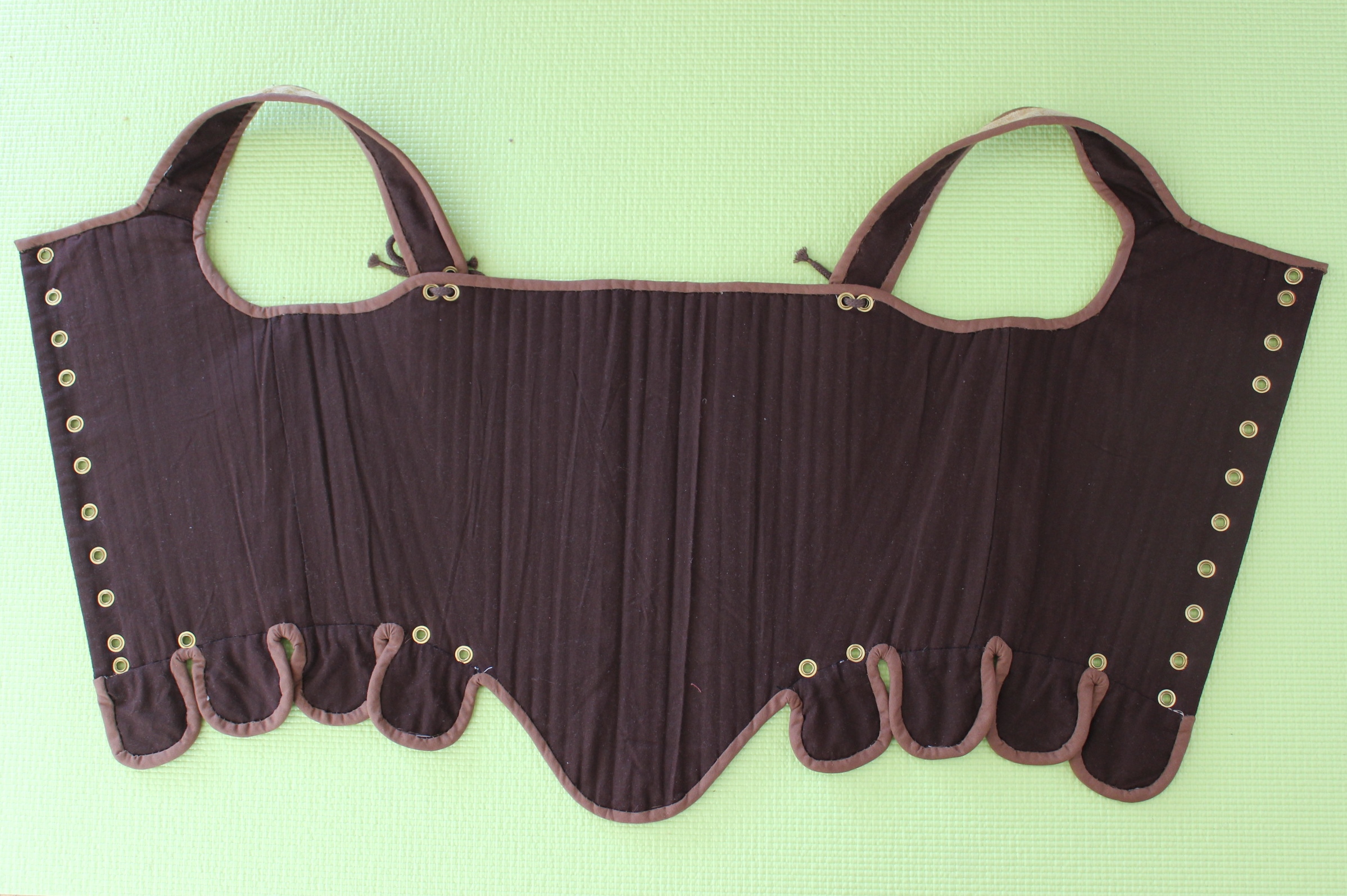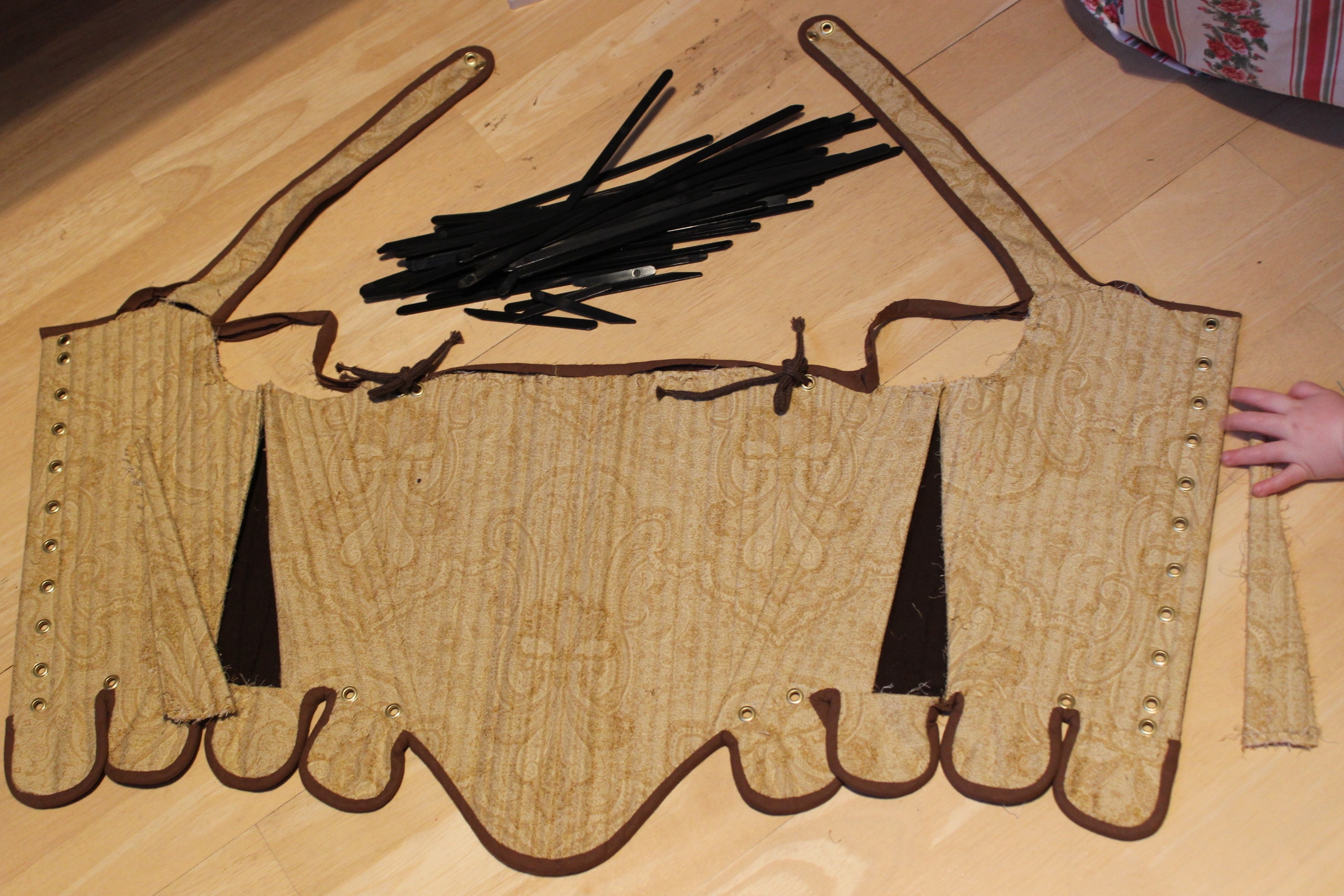 Notions: Thread, grommets, 3 m of cotton cord for lacing, 20-30 zip-ties heavy for boning, hook and eye and 1 m cotton ribbon for the skirts waist.