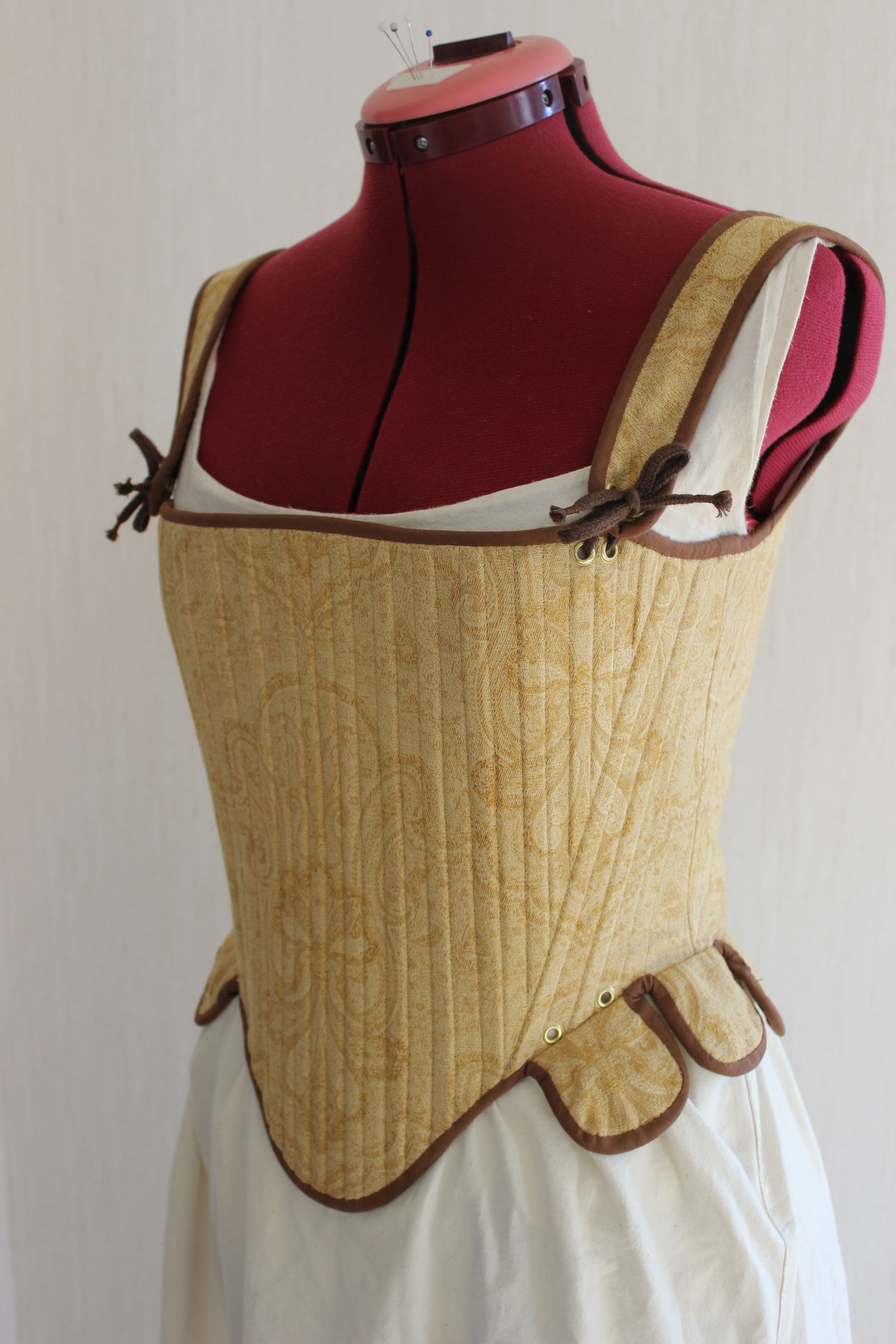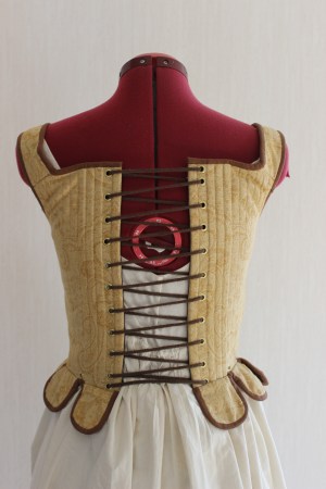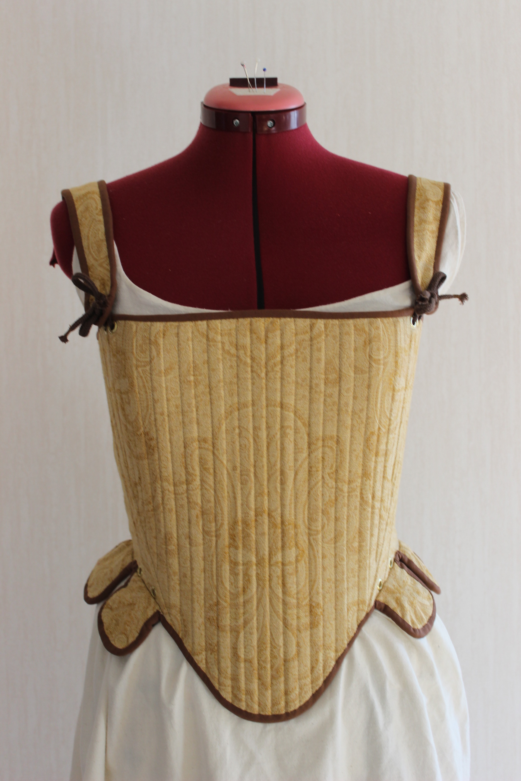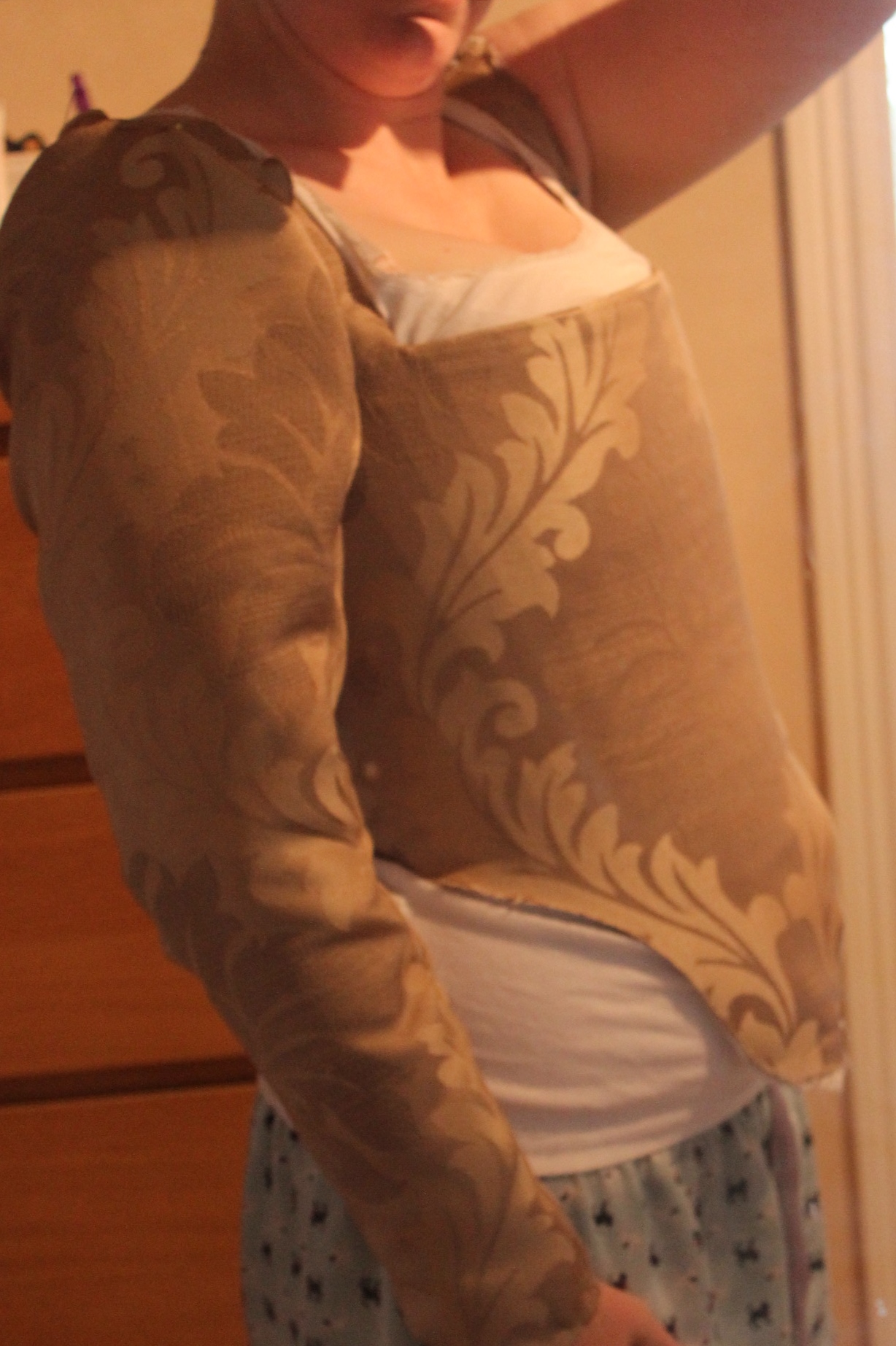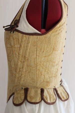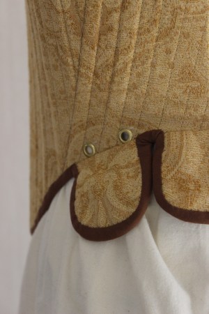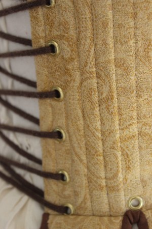 How historical accurate: Not at all except the shape. The whole thing is made with machine, in synthetic brocade using both plastic boning and metal eyelets (so sorry you guys…). But it is a clear example of how my knowledge and skill have grown and since they will never be seen, it don’t bother me as much as it probably should. about 3/10.