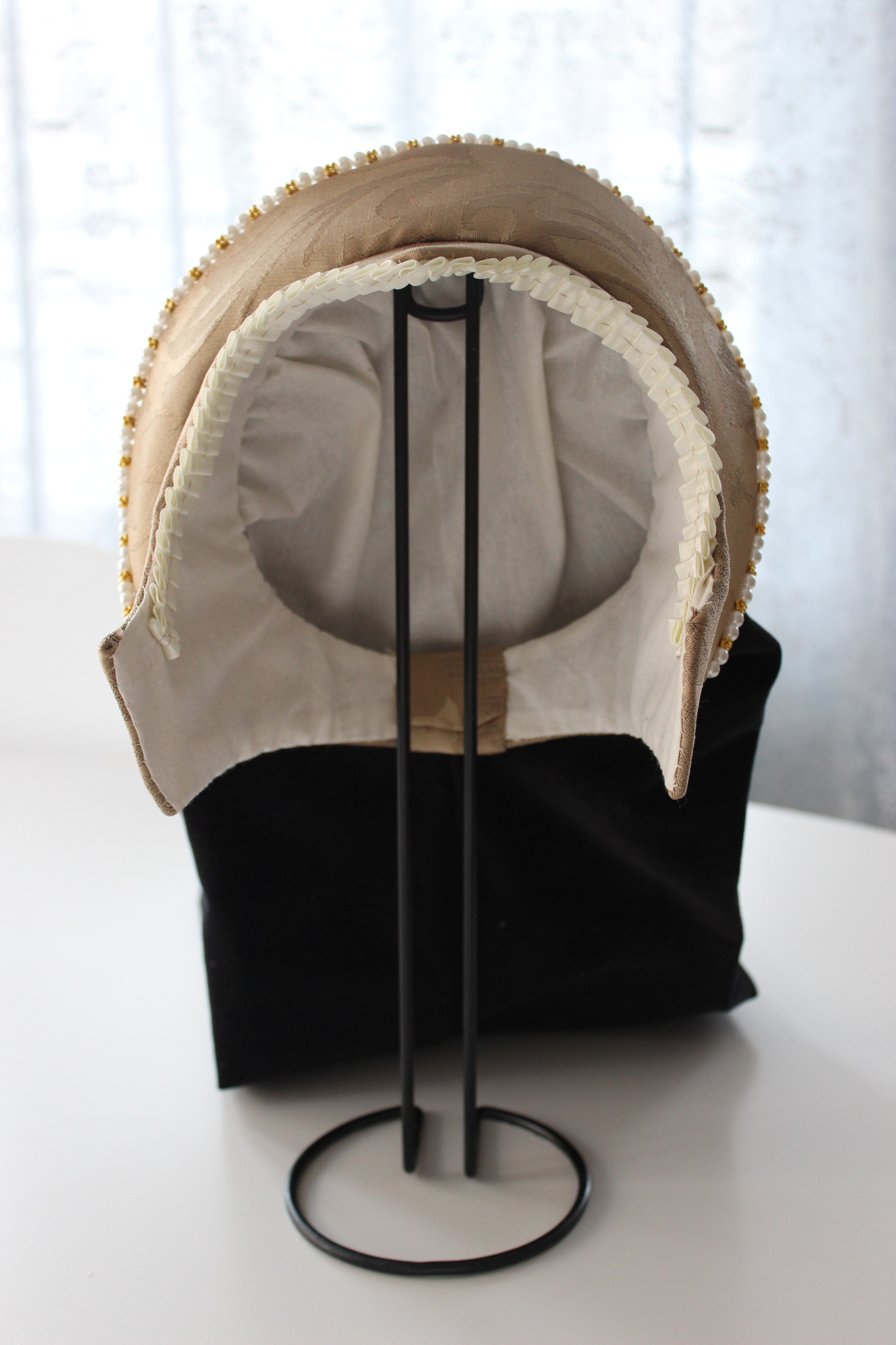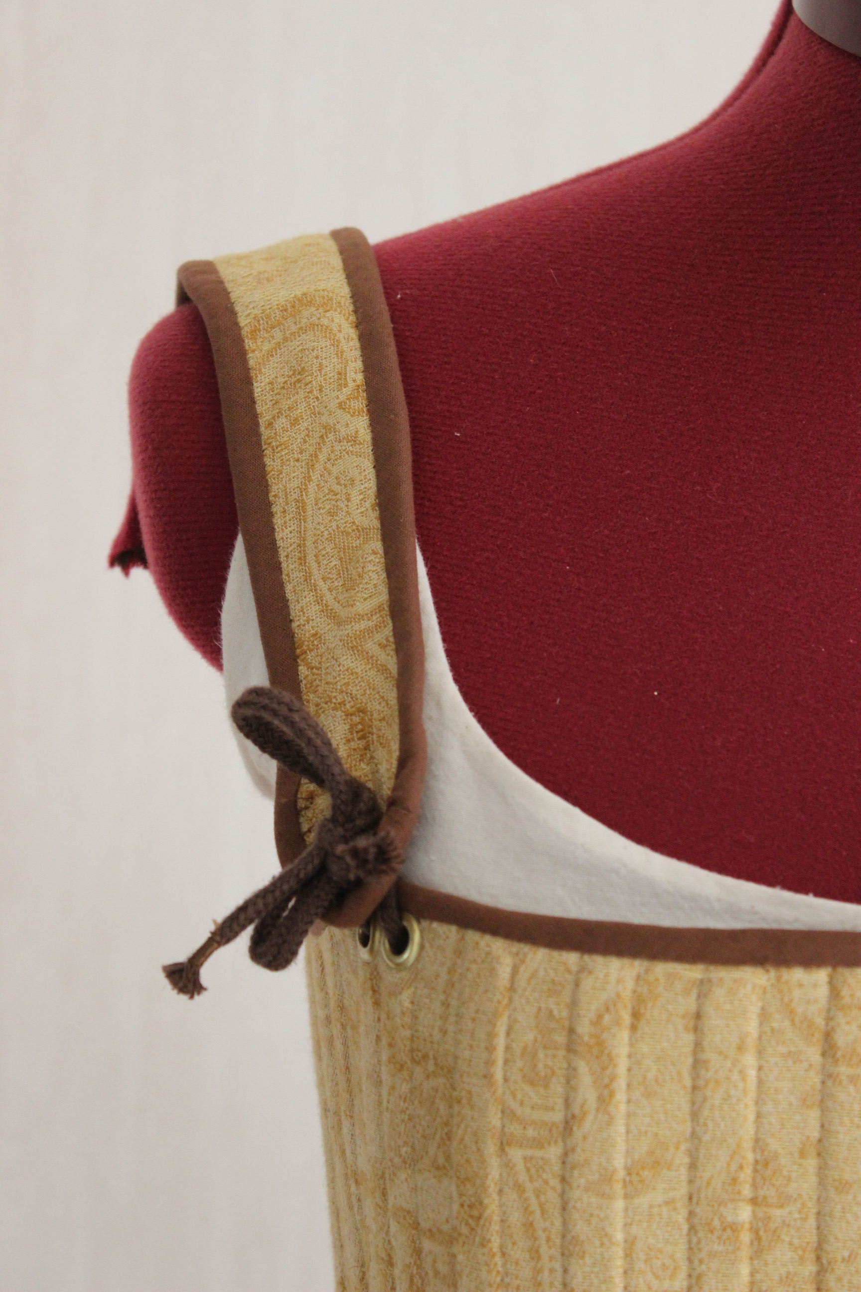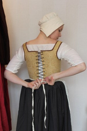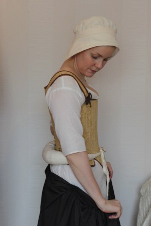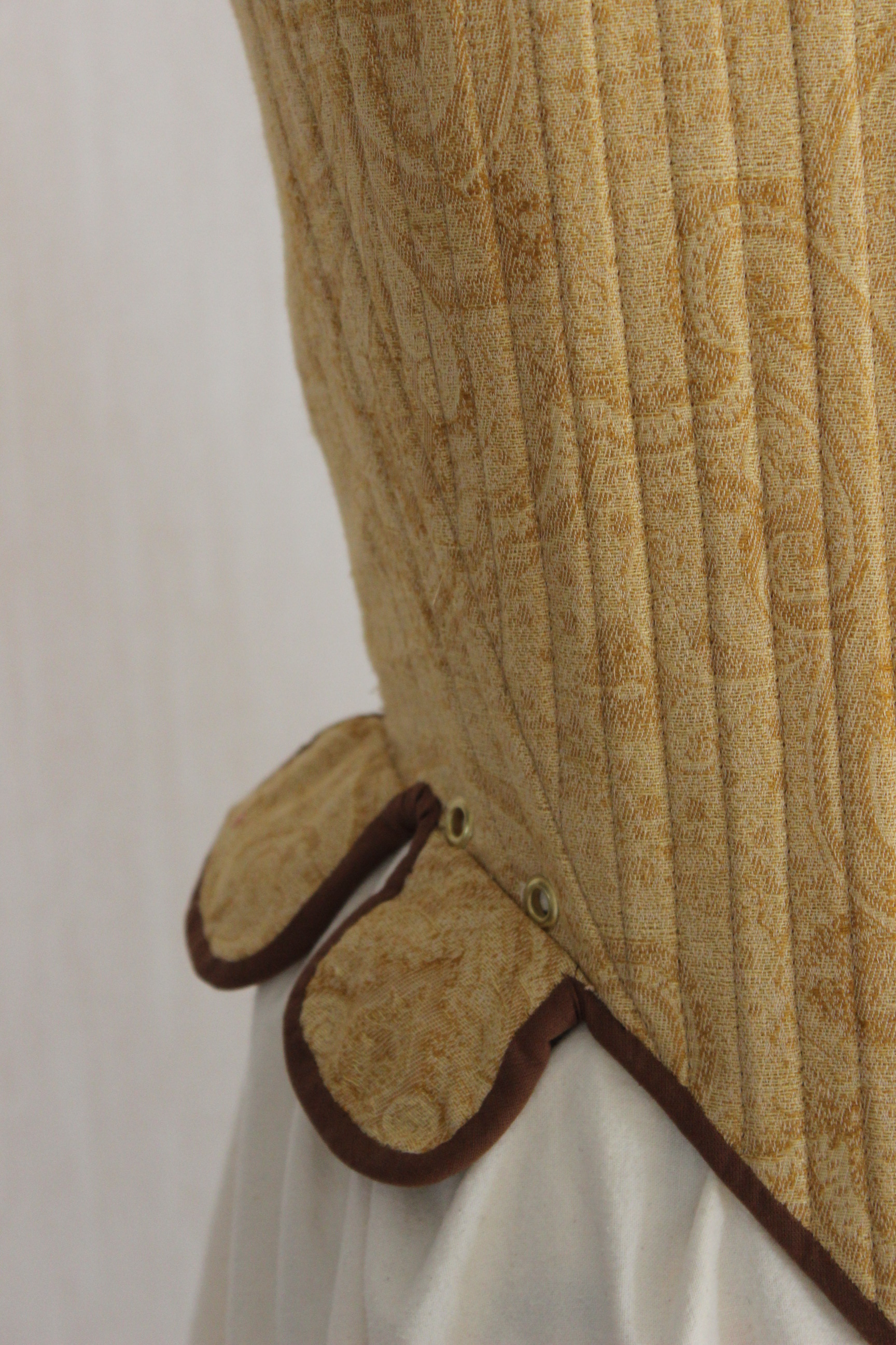 How historical accurate: Not at all except the shape. The whole thing is made with machine, in synthetic brocade using both plastic boning and metal eyelets (so sorry you guys…). But it is a clear example of how my knowledge and skill have grown and since they will never be seen, it don’t bother me as much as it probably should. about 3/10.