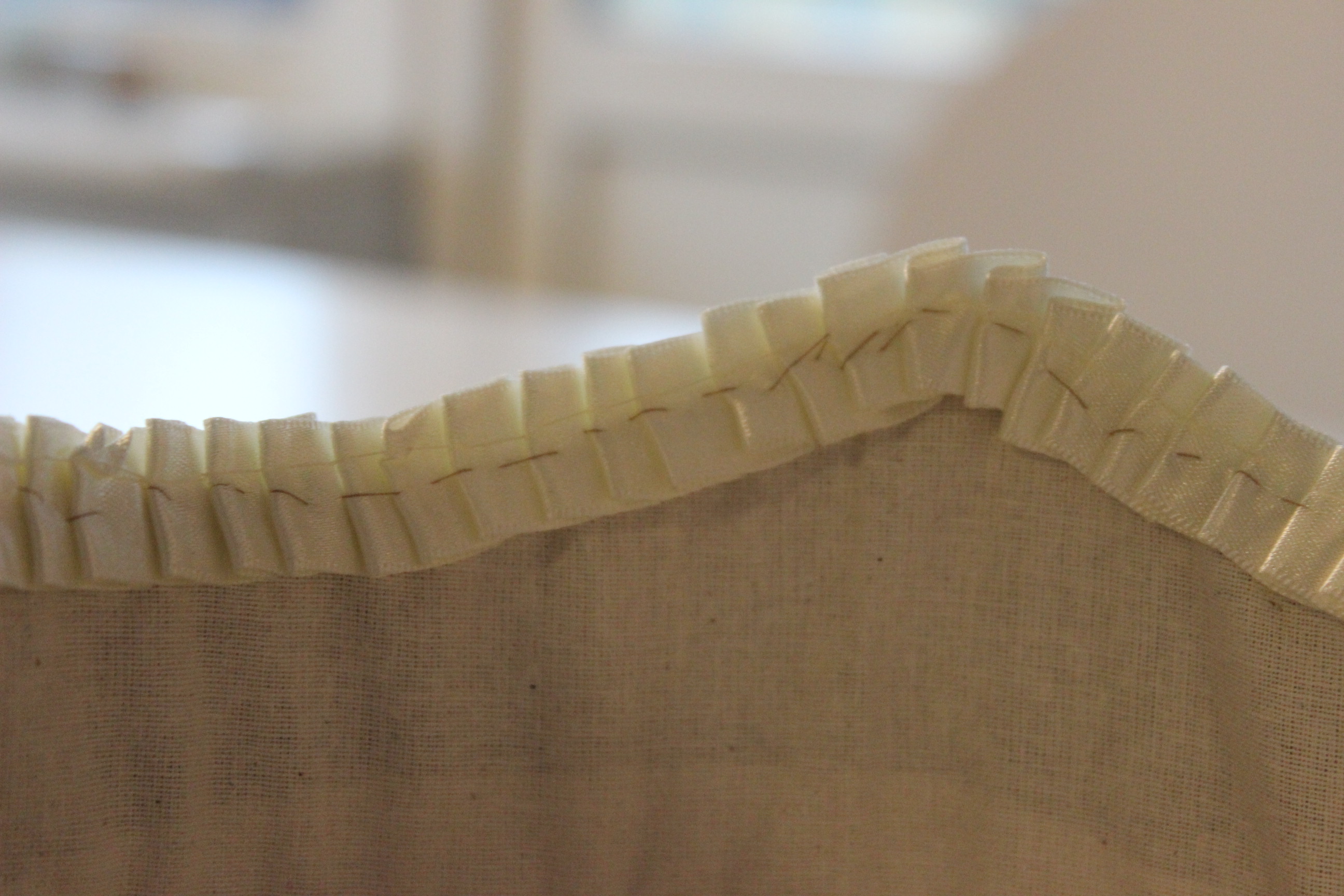 I then stitched a piece of cotton ribbon to the top as a waistband, sewed on a hook and eye and put the whole thing on my dress-form (over bumpad and several petticoats, of course) to pin the hem. img_0987 I cut and stitched the hem using 15 cm wide pieces of cotton fabric to the inside.