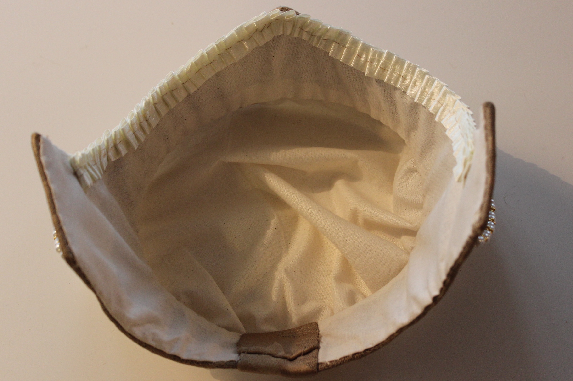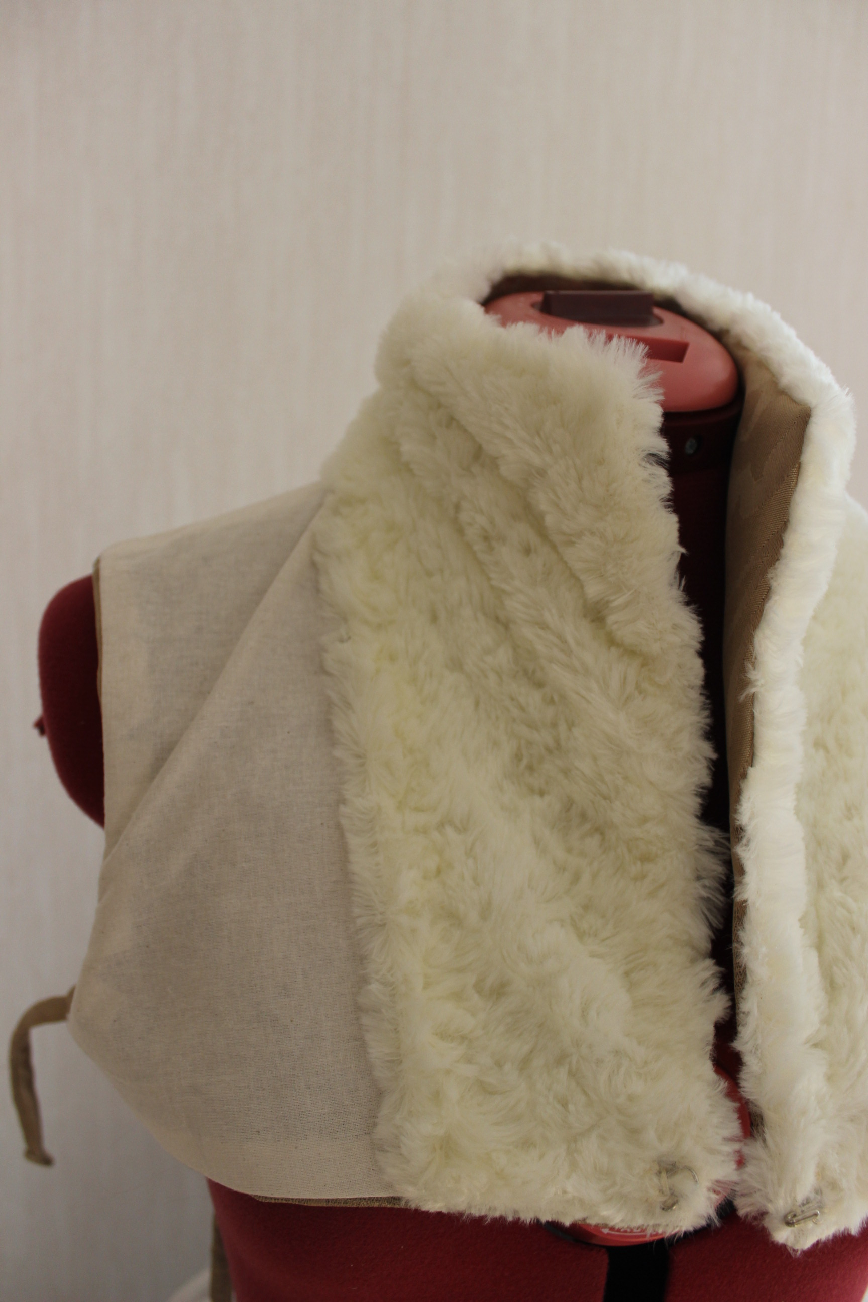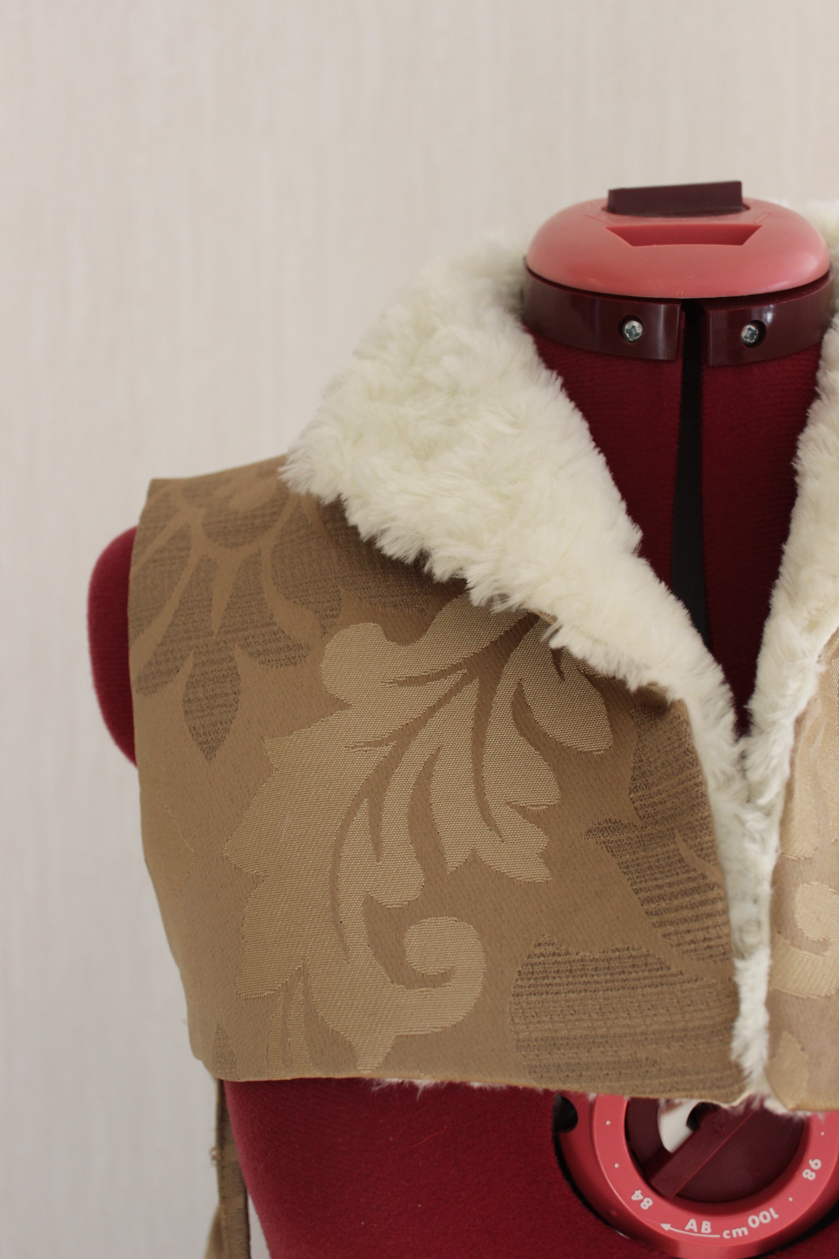 Fabric & Notions: Scraps (2 pieces about 30 x 50 cm) of brocade and white cotton sheets, 3 pieces of fake fur (about 30 x 20 cm) and thread.