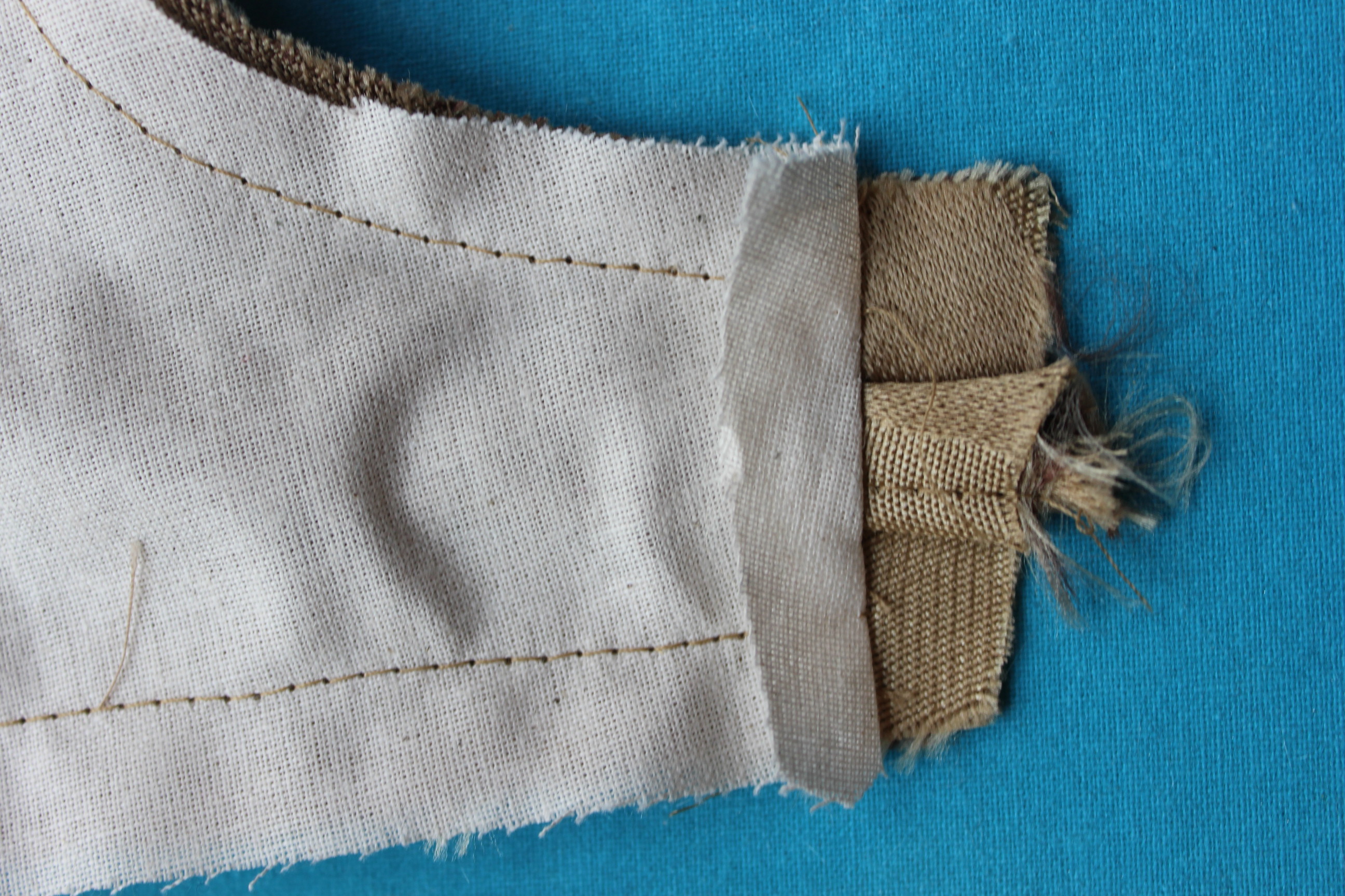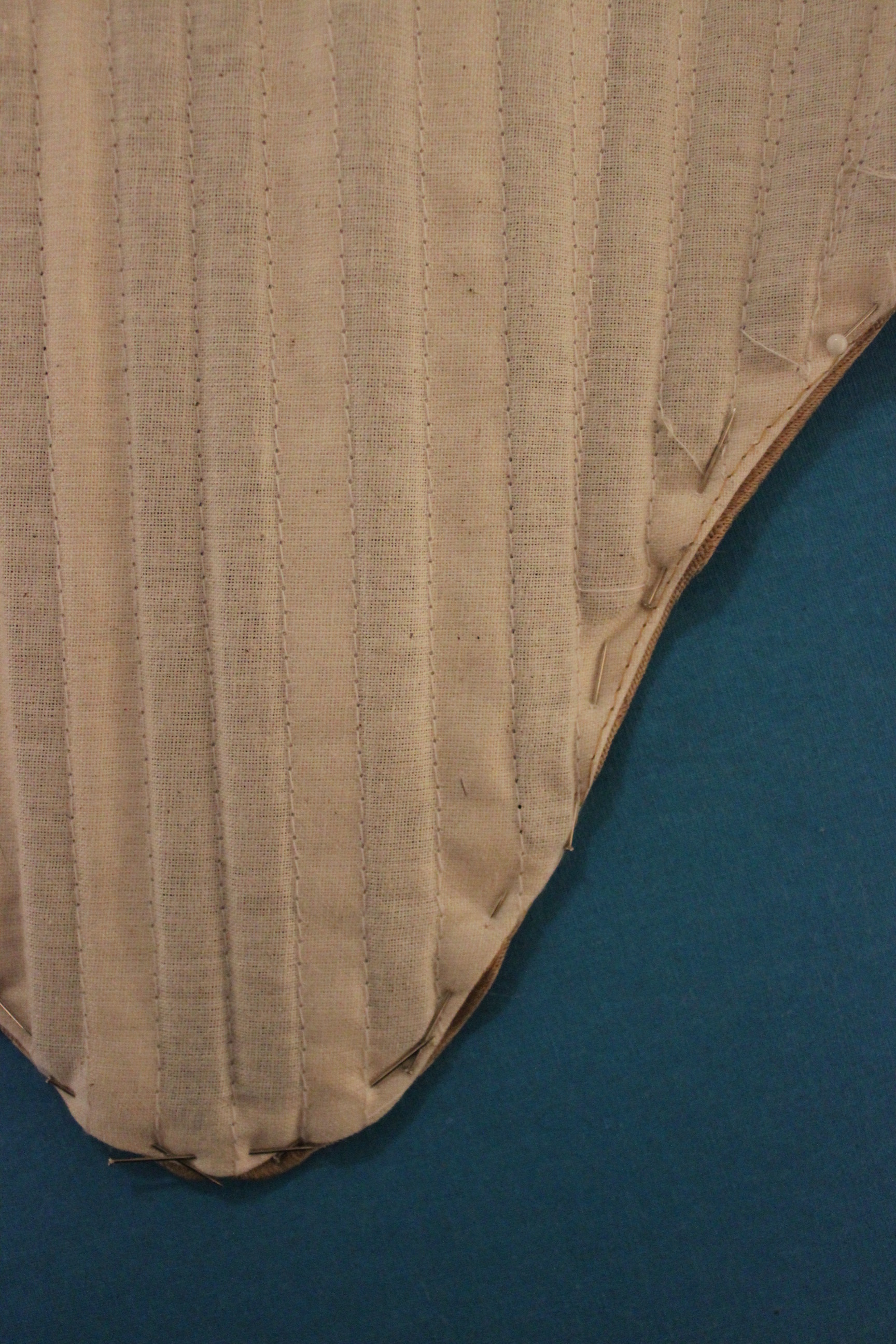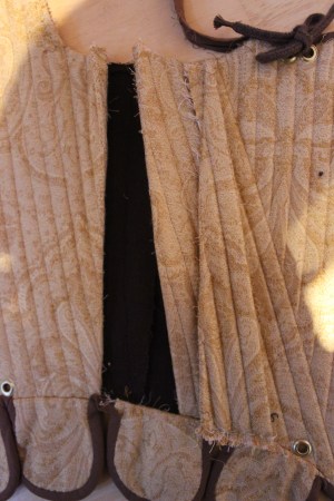 I finished the bodice by hand-stitching the lover edge, adding the sleeves and making a modesty placket to go behind the lacing.img_1336Last few stitches…