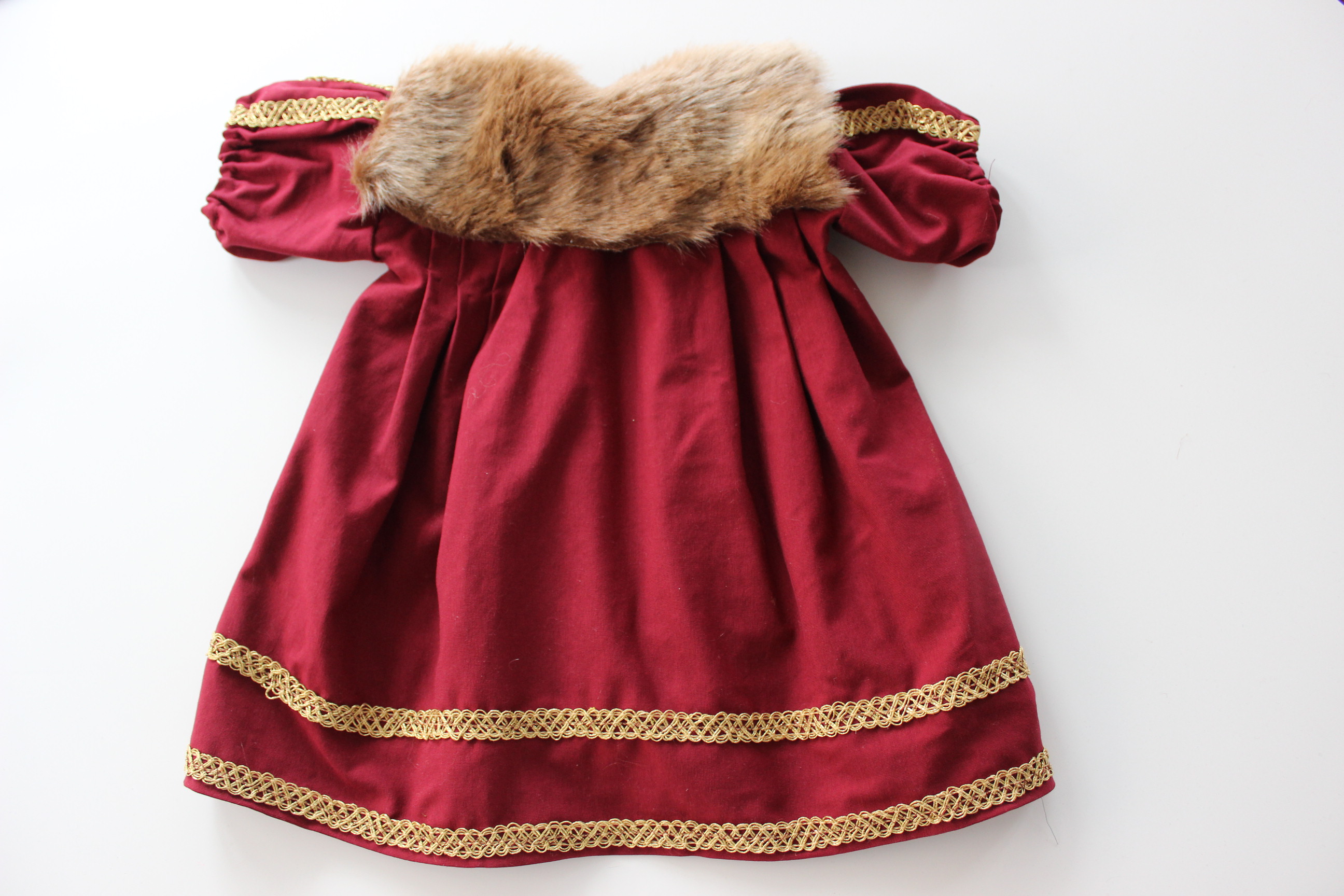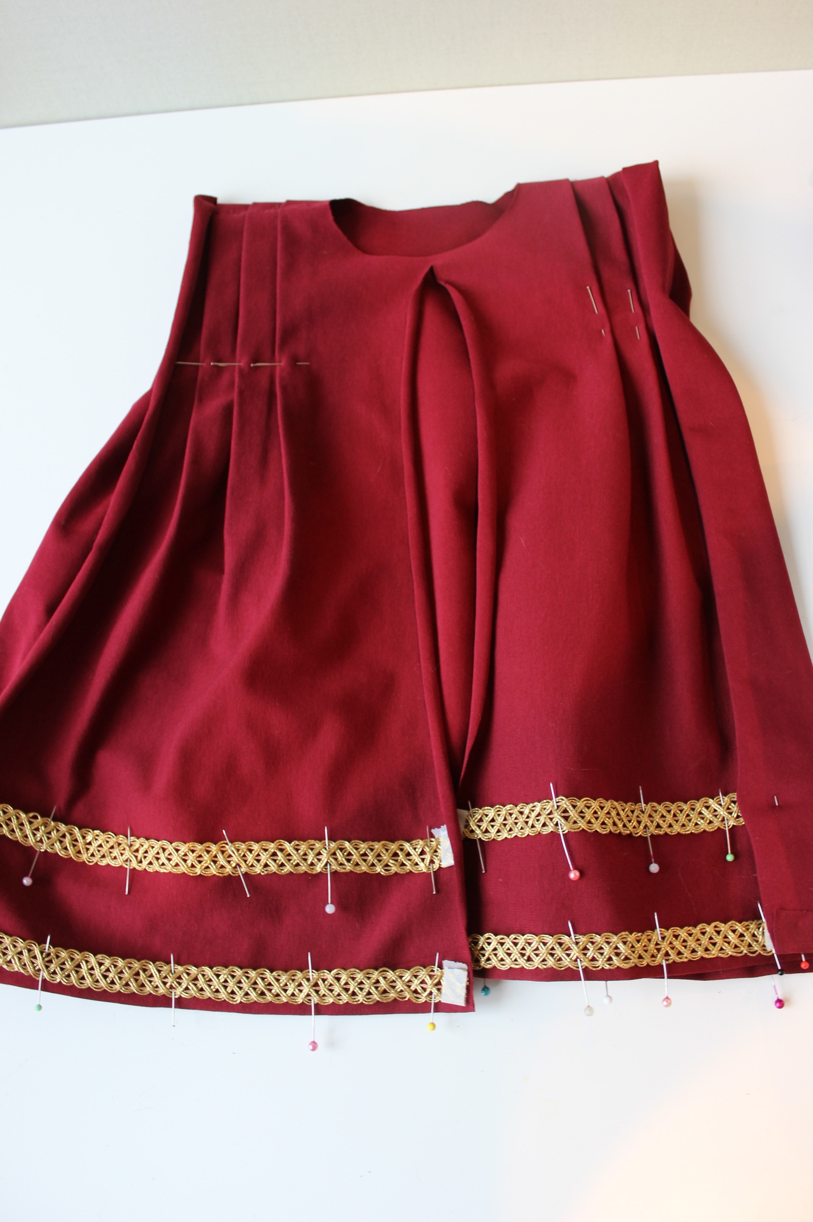 I cut a rektangel from the red fabric, folded it over cut it open at the front and pleated it at the shoulders. Then I stitched on some decoration.img_1261