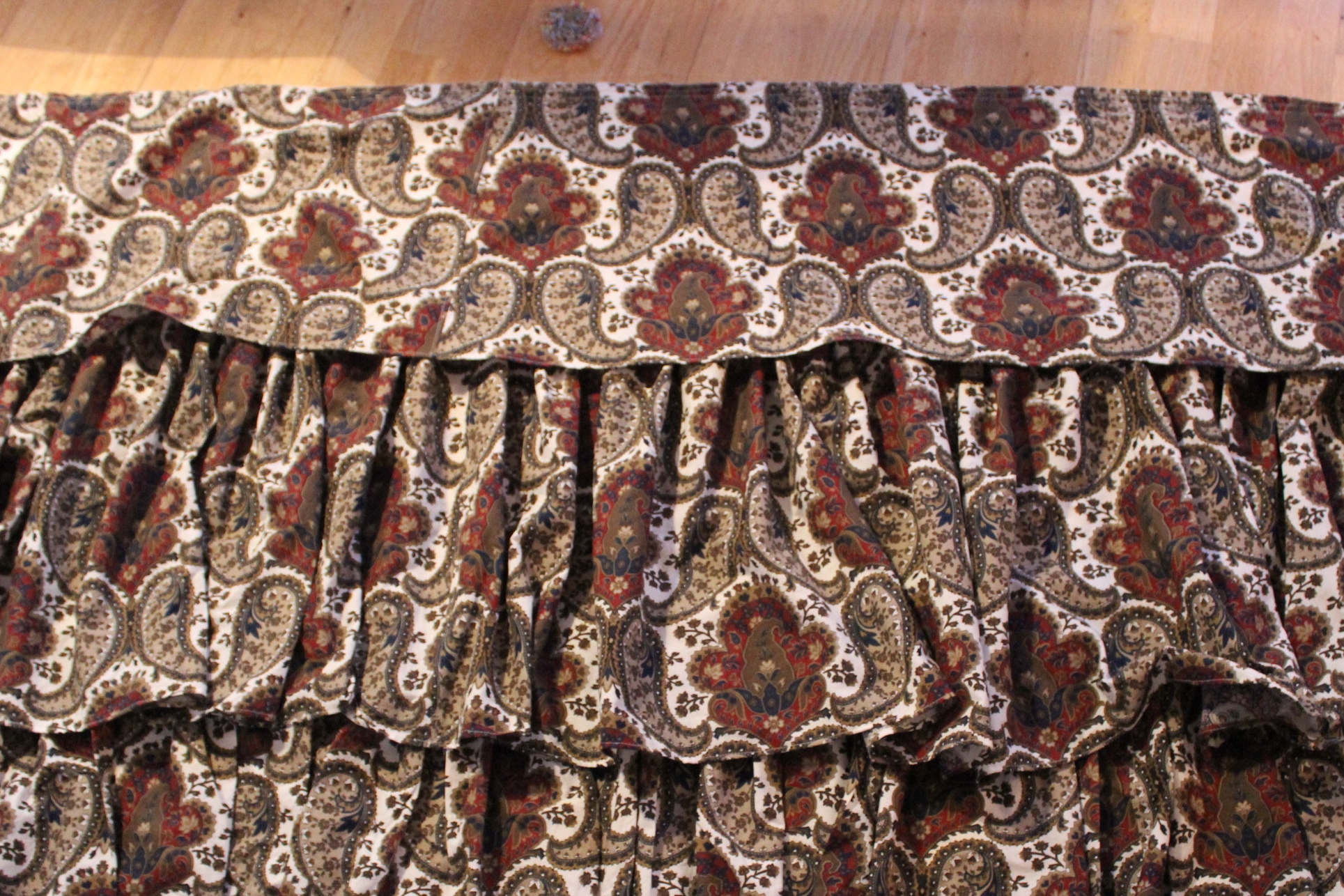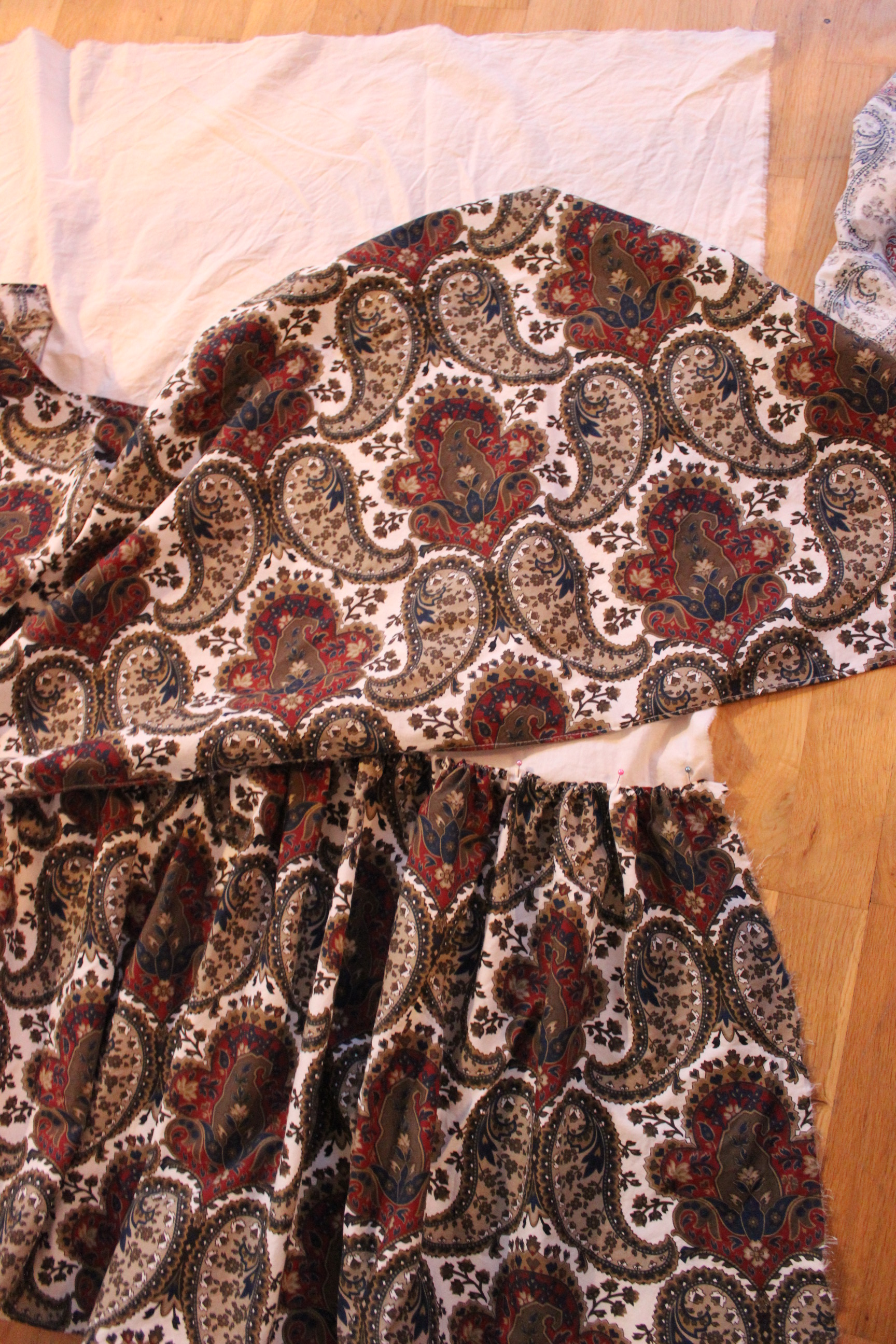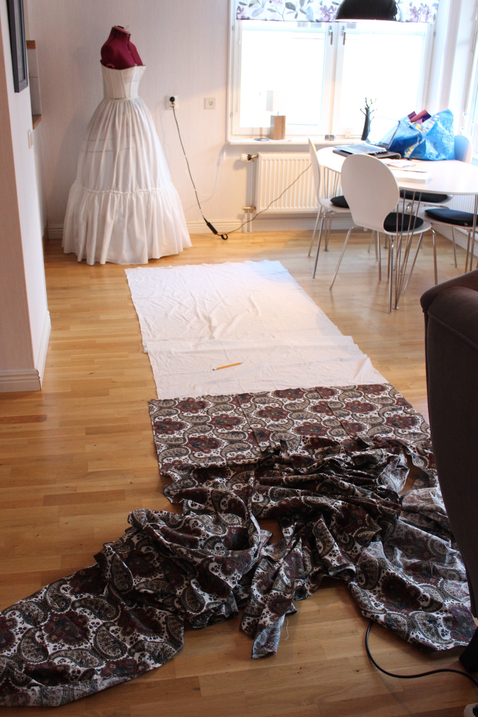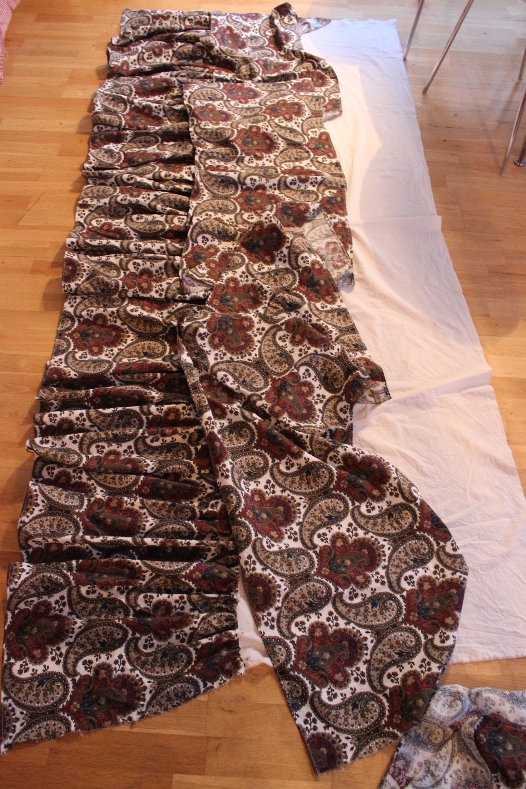 Final thoughts: I had some trouble deciding on the bottom flounce.The original calles for fringes, but there was no way I was going to get hold on some cheap and sutable ones in time. I did try to make my own, but they lacked the weight neccesary to hang nicely. In the end I opted for a narrow flounce, and I’m pretty happy with the result.