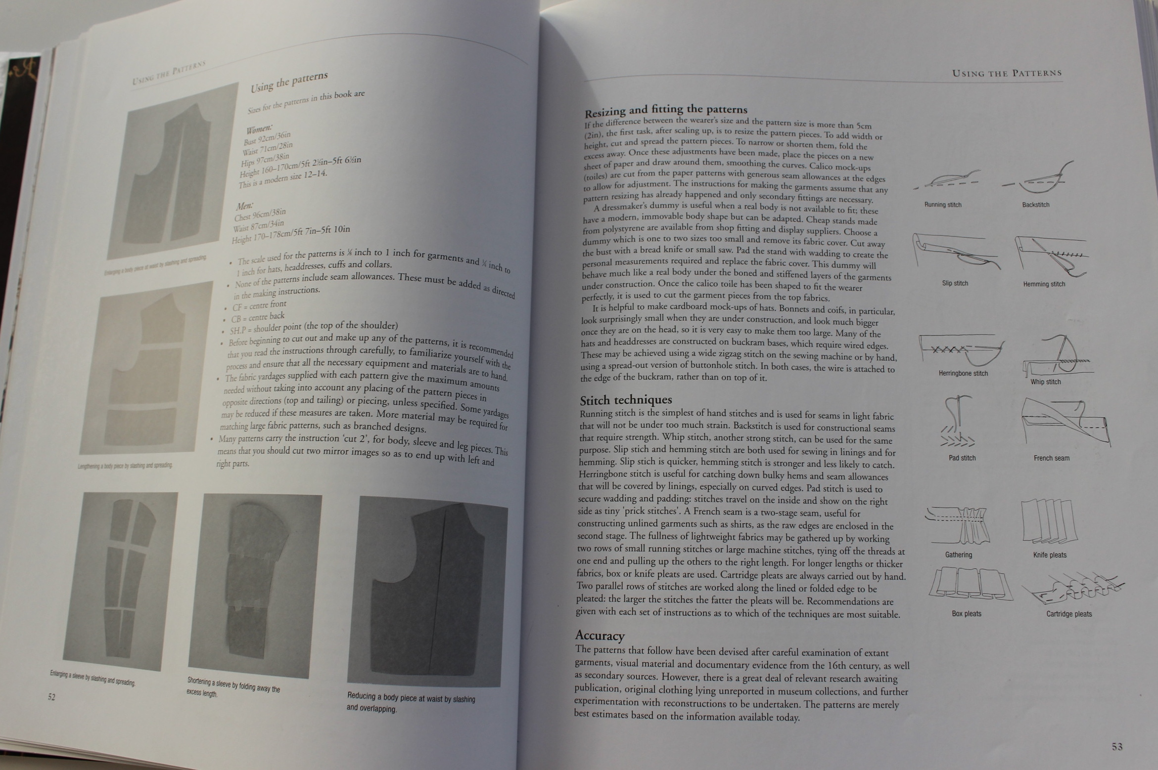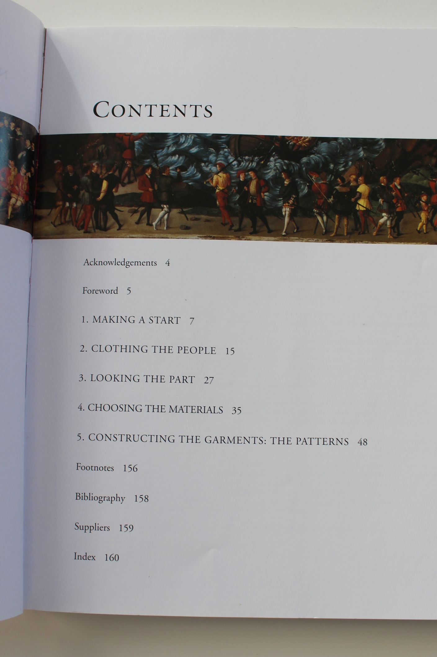 The firs 50 pages describes the styles, fabrics and methods used during the 16th hundreds, and gives you a great over view of the different garments and accessories needed to complete the costume.
