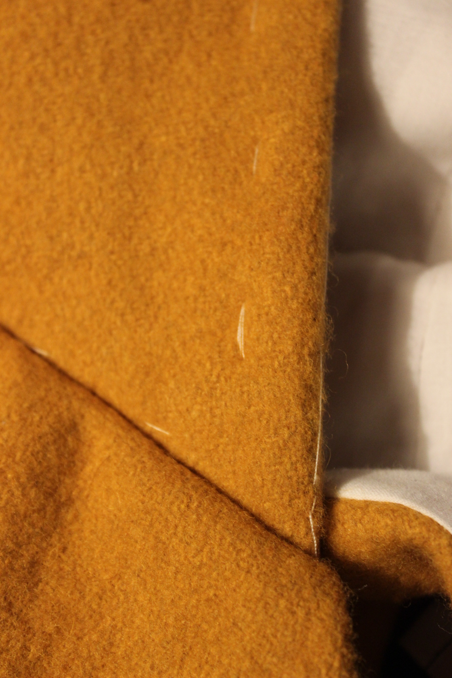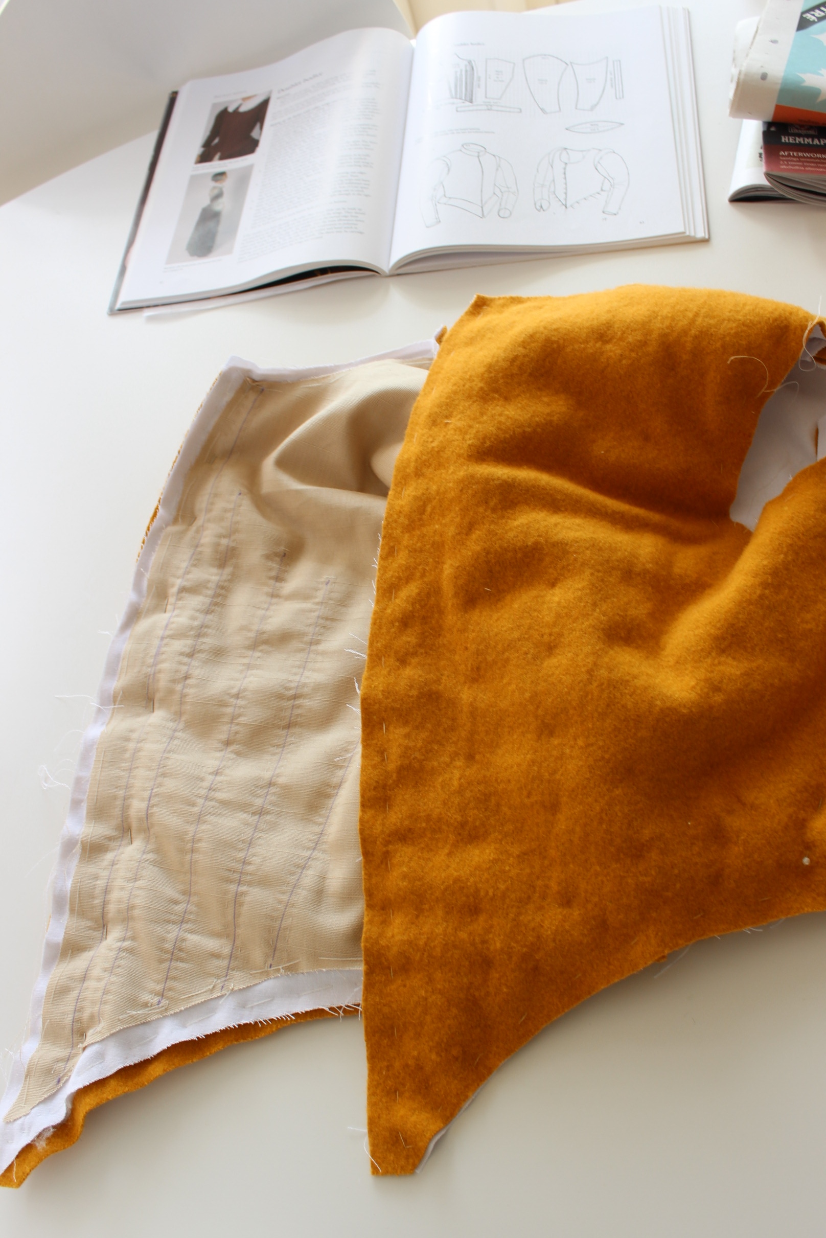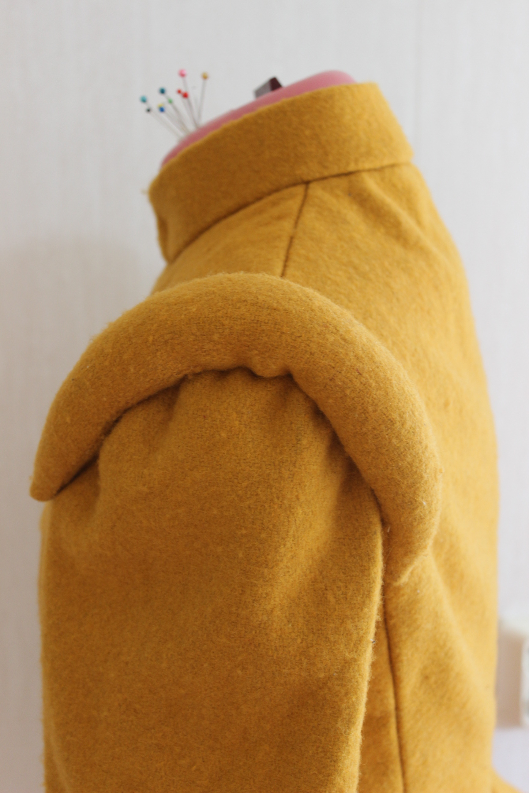 Fabric: 1, 4 m of yellow wool, 1,4 m of white cotton for lining, 1,4 of twill and 0,5 m of heavy linen for interlining.