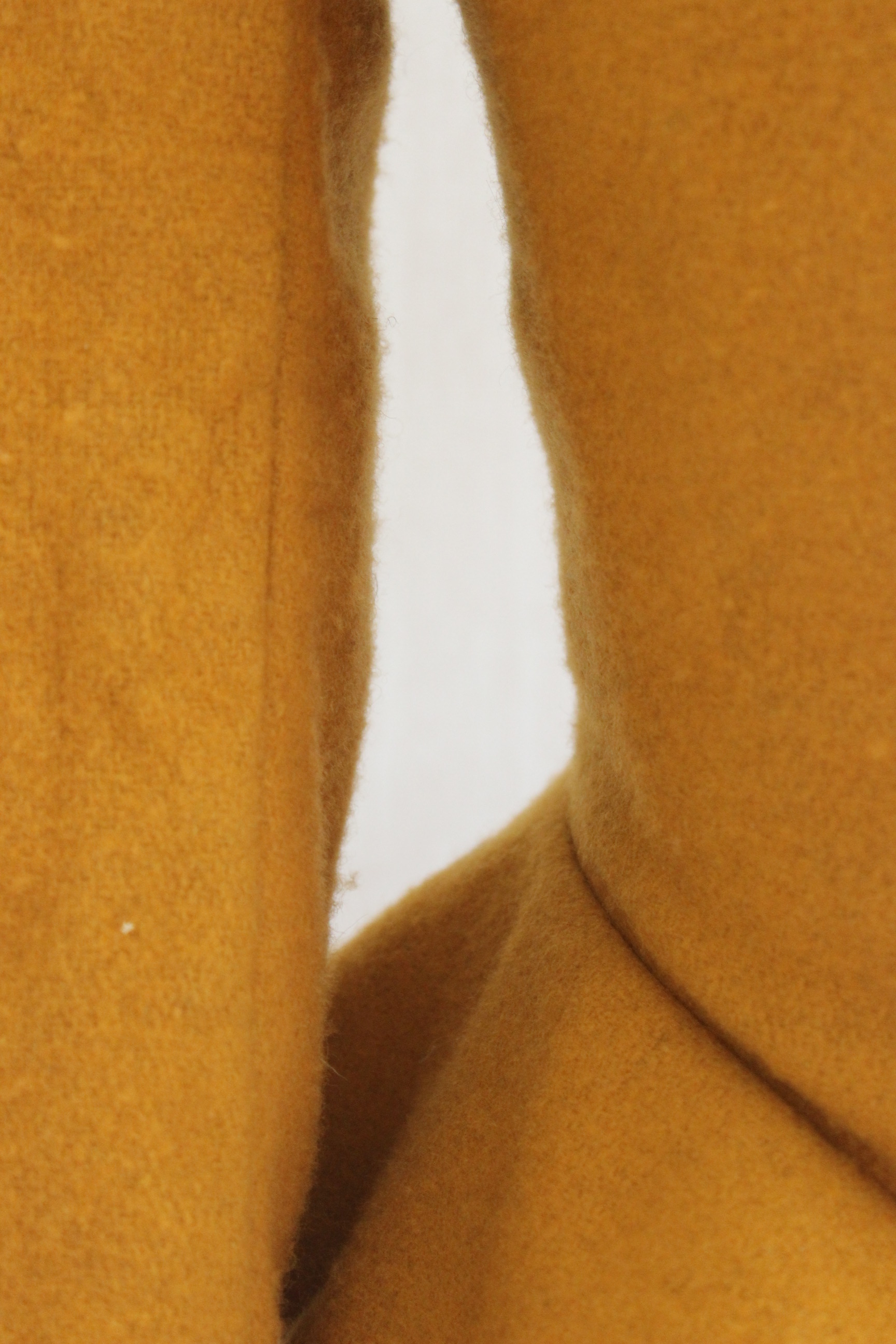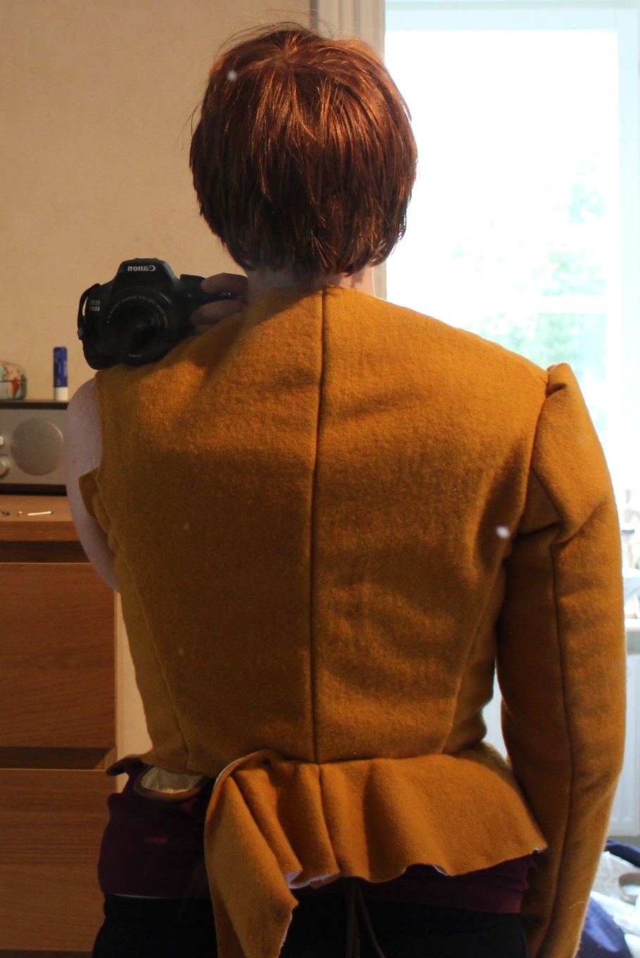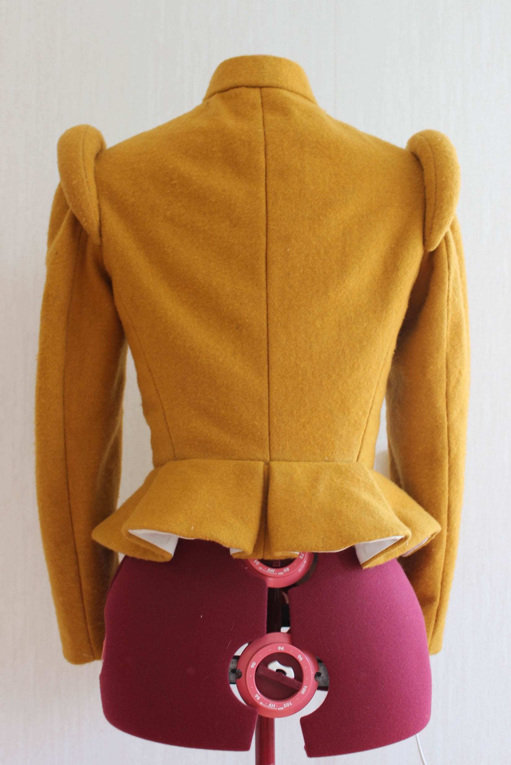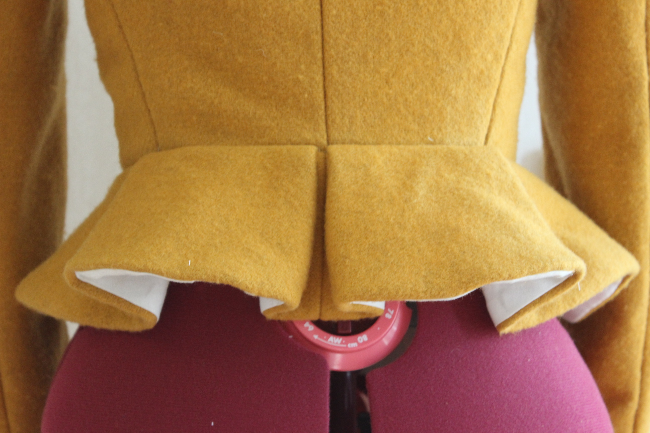 Fabric: 1, 4 m of yellow wool, 1,4 m of white cotton for lining, 1,4 of twill and 0,5 m of heavy linen for interlining.