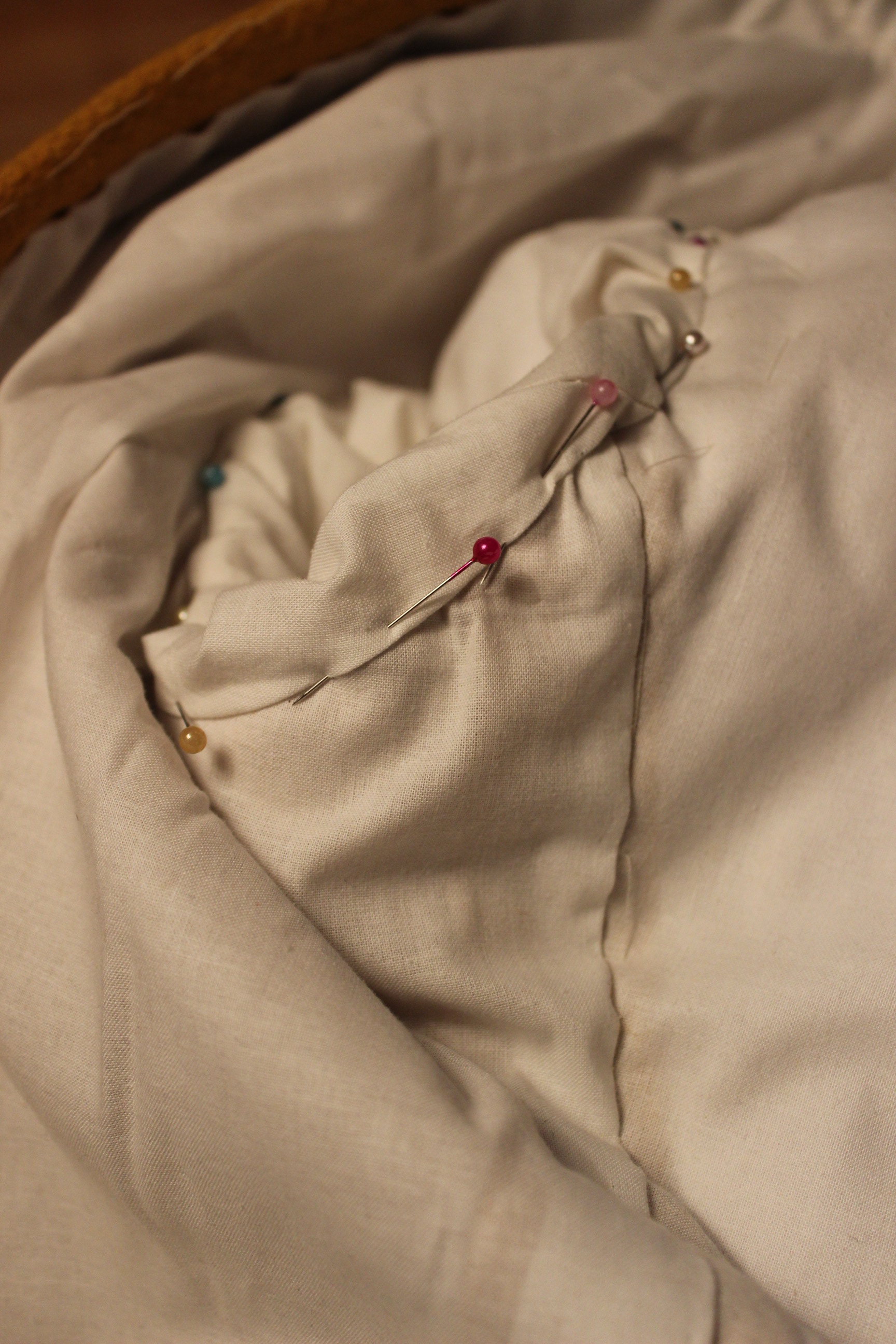I stitched the bodice together, added the collar, the boning, put the sleeves in and attached the lining.IMG_2800Pinning the sleeve lining to the arm hole.